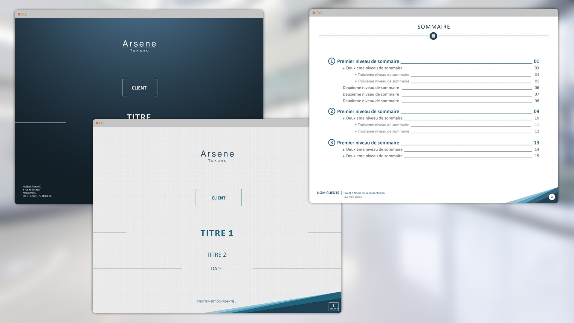 Le cabinet Arsène-Taxand souhaitait renouveler les templates utilisés en interne par leurs collaborateurs, tant pour les présentations clientèles que pour les remises de rapports.