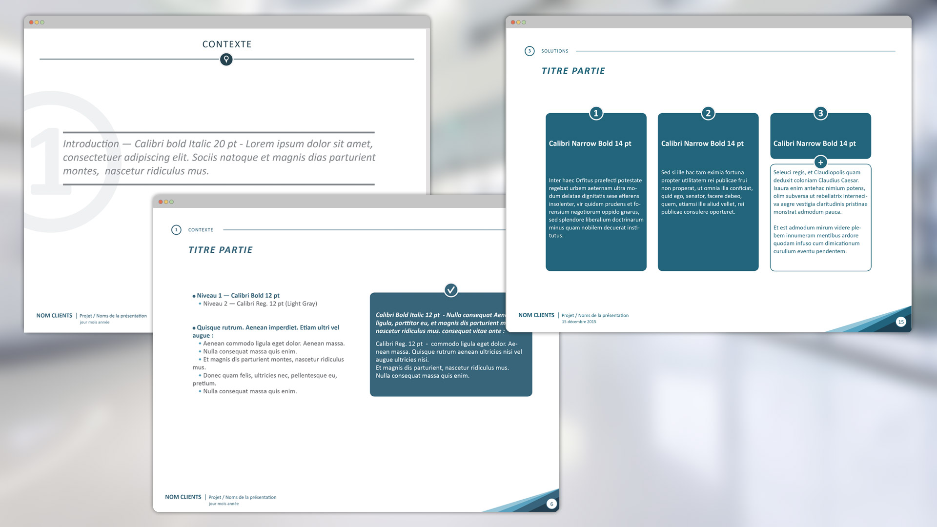 Afin de répondre au mieux à cette demande, il a été mis en place des éléments graphiques et typographiques afin de rajeunir les présentations tout en rendant les templates facilement utilisables. Les seules contraintes étaient de réduire la palette colorimétrique et de conserver les polices de caractères utilisées auparavant.